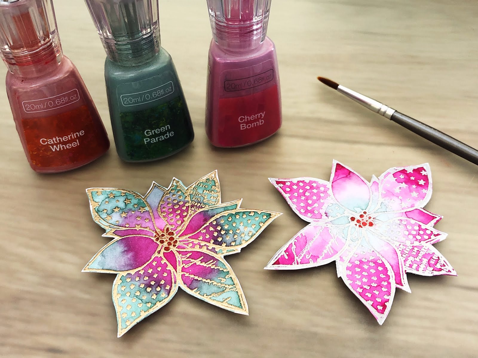 In the video I show how you can make the background with the Shimmer Powders very easy and with lots of texture. And I use the same colours with a pink added to colour the images using a brush and I walk you through the complete process. So be sure to watch today's video to see all techniques in action.